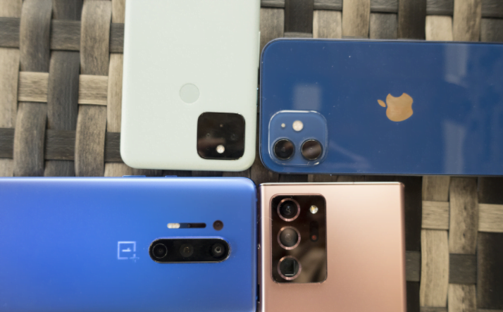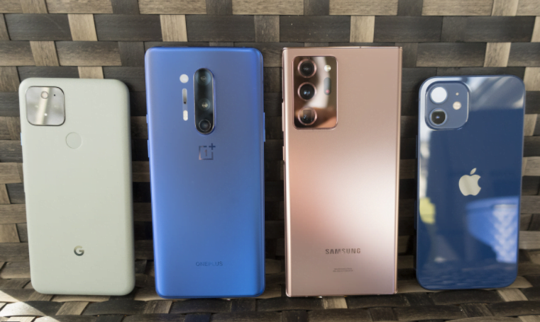 Pixel 5 (kanan bawah), OnePlus 8 Pro (kiri bawah), Samsung Galaxy Note 20 Ultra (kanan atas) dan iPhone 12 (kiri atas)