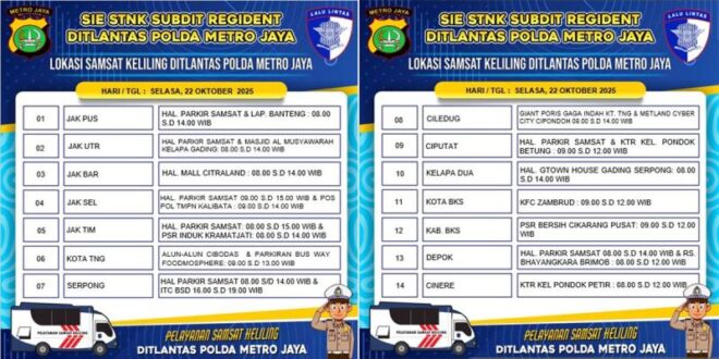 Untuk hari Selasa ini, layanan Samsat Keliling tersebar di berbagai titik strategis di lima wilayah Jakarta, serta sejumlah kota dan kabupaten di Tangerang Raya, Bekasi, dan Depok. Berikut adalah rincian lokasi dan jam operasional yang perlu Anda catat: