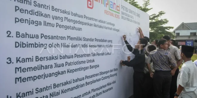 Jakarta – Sebanyak ribuan santri dari berbagai daerah di kawasan Banten menandatangani petisi yang berisikan komitmen membangun negeri serta menjaga marwah pesantren di Indonesia, pada kegiatan Santri Land Festival 2025 di Tangerang Selatan, Banten, Minggu.